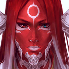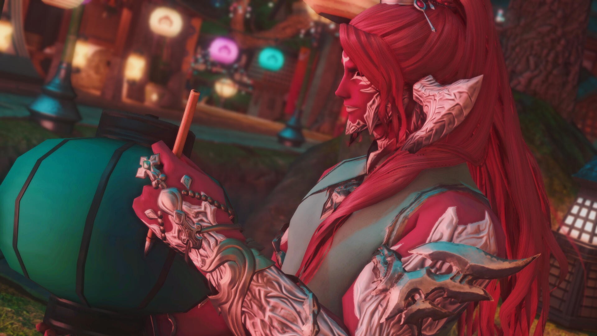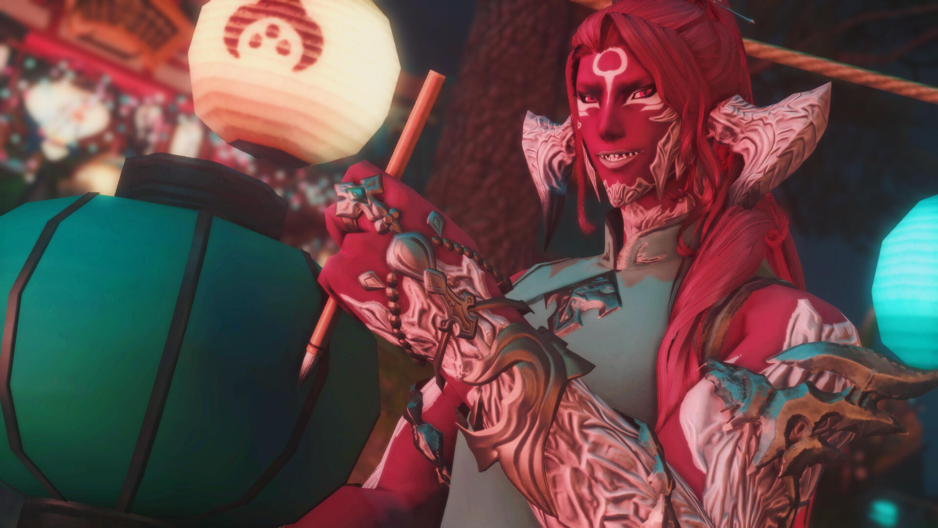A Doman native with a matronly voice, Shizue Onna attentively tends the lantern stall with a loving gaze. Her scarlet hair drapes long down a silken dress of green. A koi hairpin secures a bun behind her horn.Whether in a group or alone, Shizue's gaze somehow locks with you and her grin is wide and filled with triangular, pearlescent teeth. The closer you come the louder the scent of fish hits your nose.