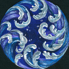 A silken pouch sewn in the shape of a clamshell with embroidered waves of violet and silver. A gold tassel hangs from it.
